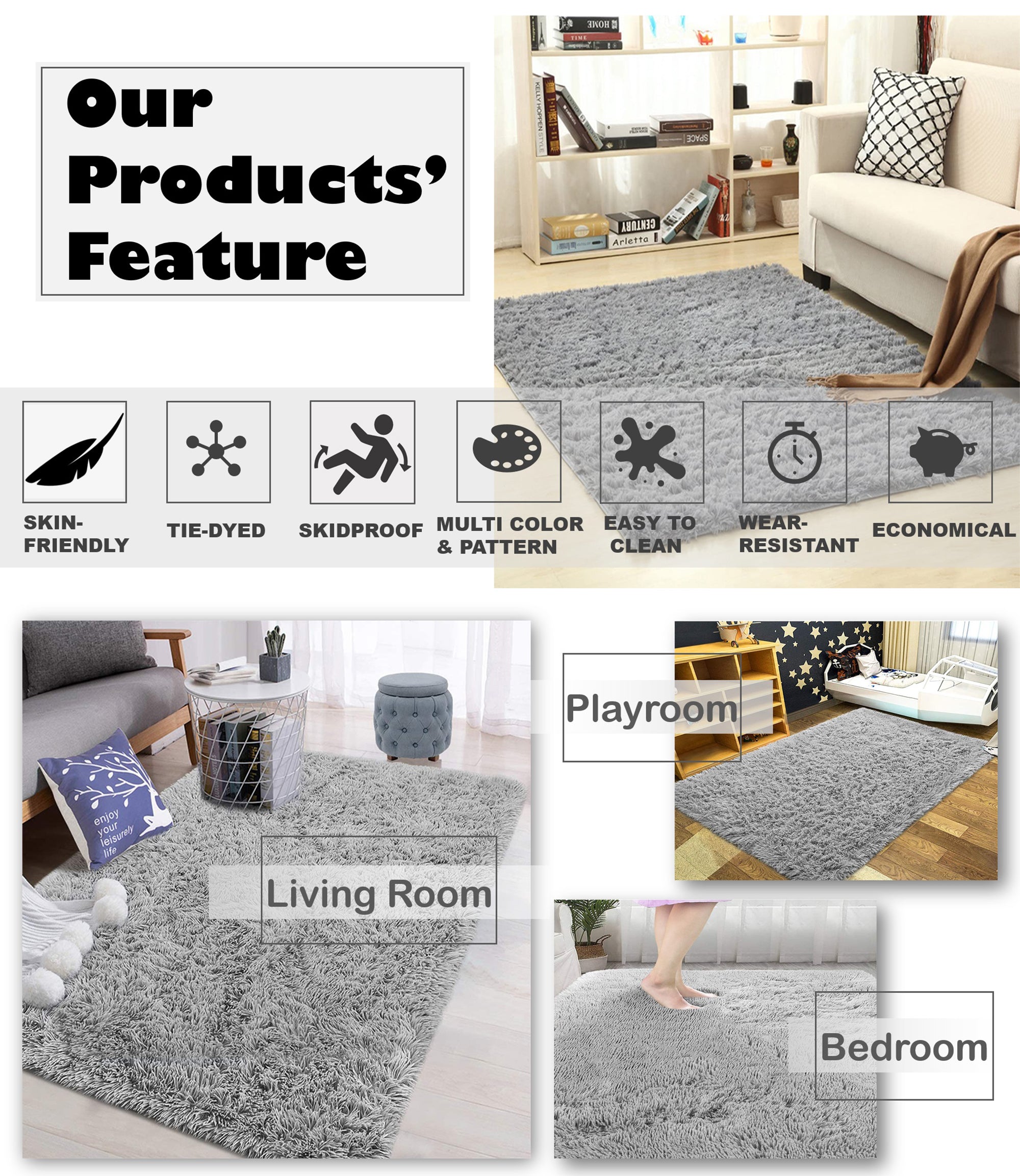 Various Color Soft Plush Rectangular Rug for Living Room or Bedroom Anti-skid Dots On The Back